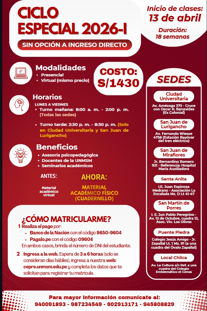El Ciclo Especial (18 semanas de duración) es de preparación exclusiva para el examen de Admisión a la UNMSM y otras instituciones.