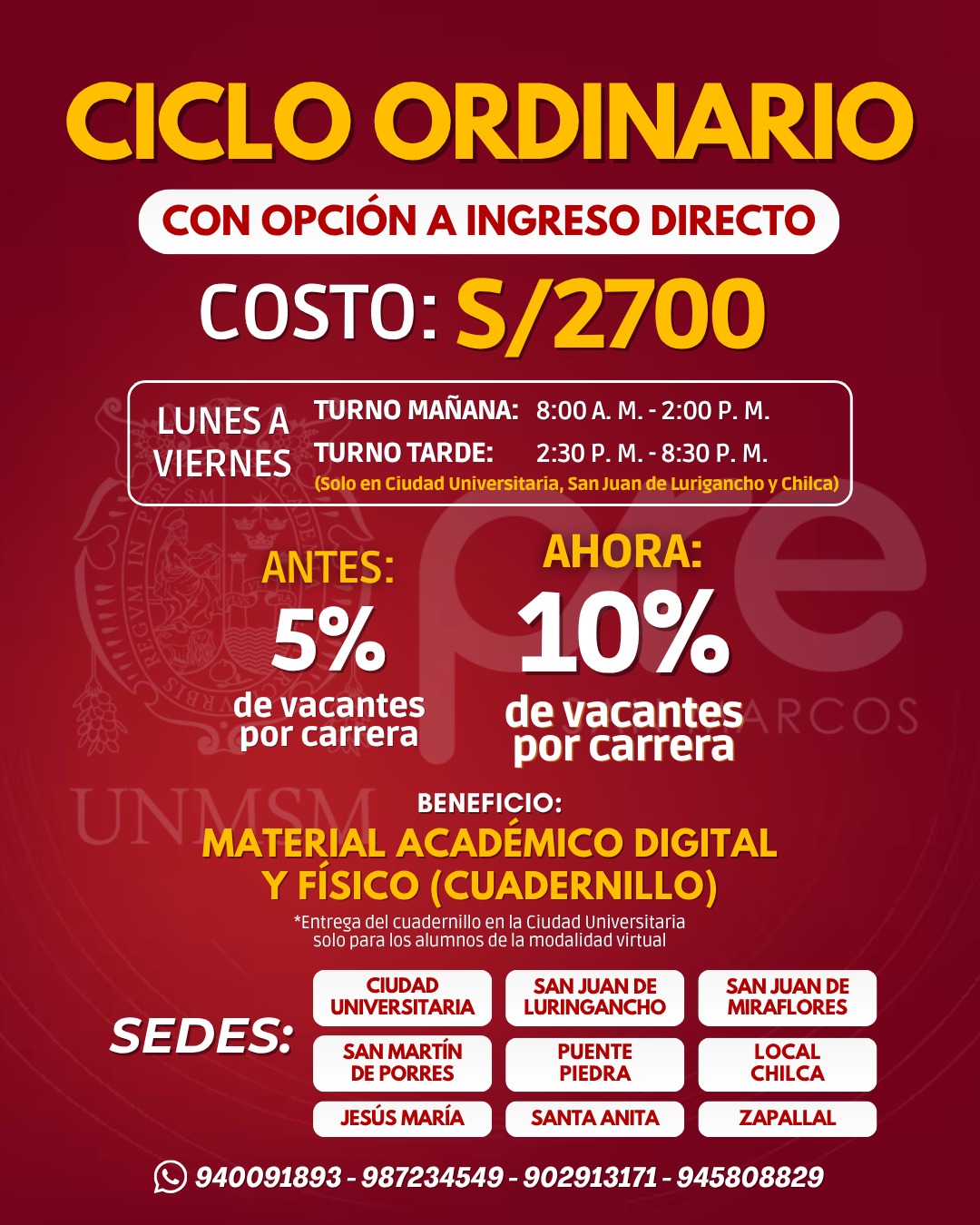 El Ciclo Ordinario (19 semanas de duración) permite alcanzar vacantes de ingreso directo para el proceso de Admisión a aquellos alumnos que cubran las vacantes en estricto orden de mérito hasta cubrir la totalidad de las vacantes .